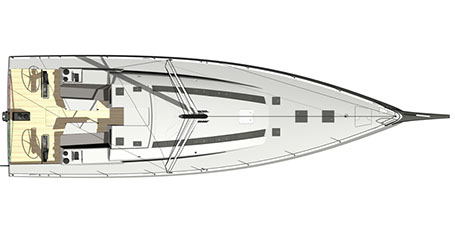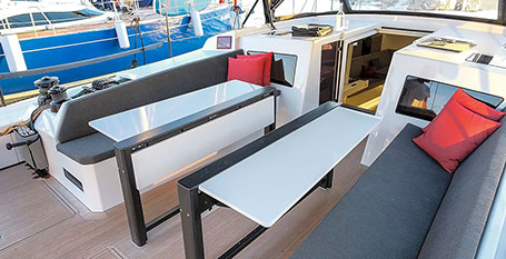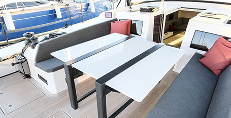 - Grand cockpit confortable et très abrité avec deux banquettes (> 2 m) et 2 tables de cockpit. Elles sont si robustes qu'il est possible de se tenir debout dessus pour ranger la grand-voile.