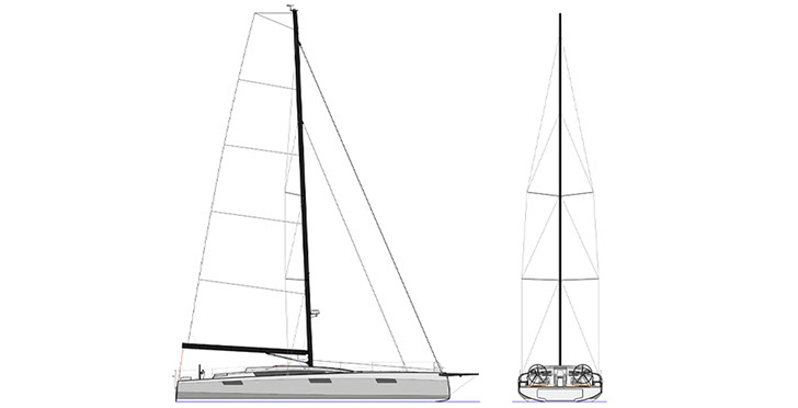 - Le mât en carbone est placé très en arrière avec des barres de flêches poussantes en carbone, ce qui signifie que le mât ne nécessite pas de pataras ou de bastaques. Cela permet d'utiliser une grand-voile à corne sans effort de manoeuvre supplémentaire.