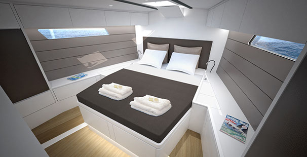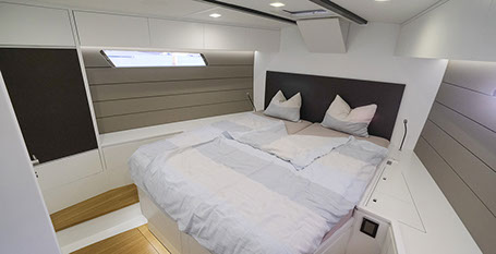 - Cabines invités très lumineuses et volumineuses à l'arrière avec grande couchette (2,00 m x 1,60 m).