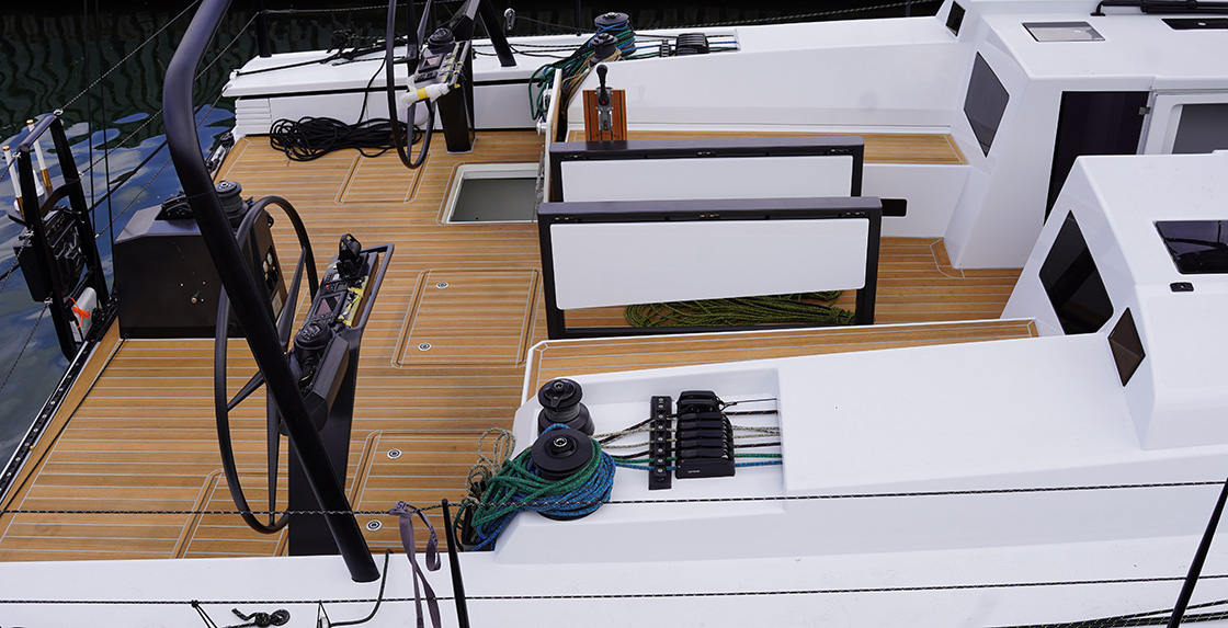 - Toutes les drisses, prises de ris et autres cordages sont ramenés au cockpit avec une réduction maximale des frottements.