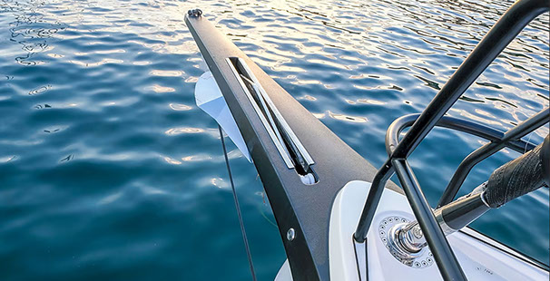 - Bouton dehors en carbone avec ferrure d'étrave intégrée pour le support de l'ancre.