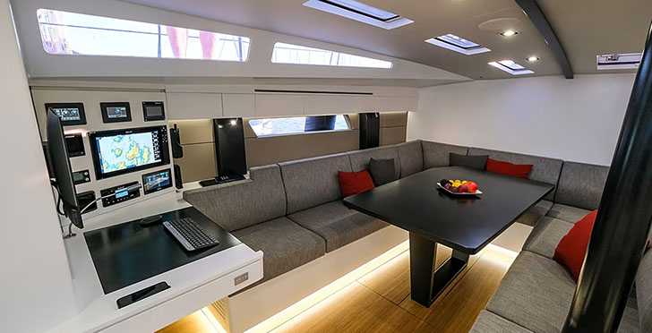 - Grand coin salon avec table à manger pour 6-8 personnes et table à cartes à bâbord.