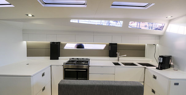 - Cuisine spacieuse à tribord avec rampe centrale pour cuisiner en toute sécurité par mer agitée.